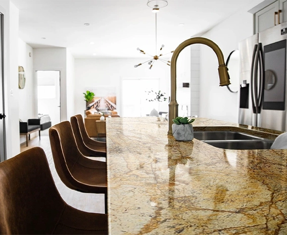 Alaska Gold countertops elevate your kitchen with their luxurious and sophisticated appearance. Featuring a stunning golden hue with delicate veining, these countertops add a touch of opulence to any kitchen design, whether contemporary or classic. The rich, warm tones create a welcoming and elegant atmosphere, making your kitchen a focal point of style. Crafted for durability, Alaska Gold countertops are designed to withstand daily use, resisting heat, scratches, and stains while maintaining their beautiful finish.